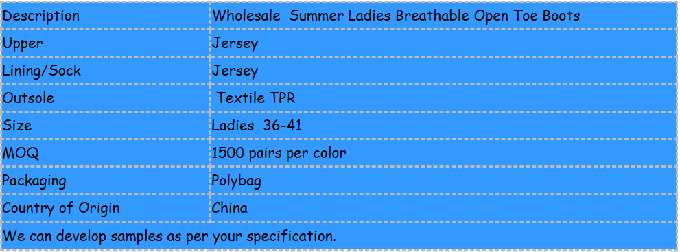 Description Wholesale Summer Ladies Breathable Open Toe Boots Upper Jersey Lining/Sock Jersey Outsole Textile TPR Size Ladies 36-41 MOQ 1500 pairs per color Packaging Polybag Country of Origin China We can develop samples as per your specif