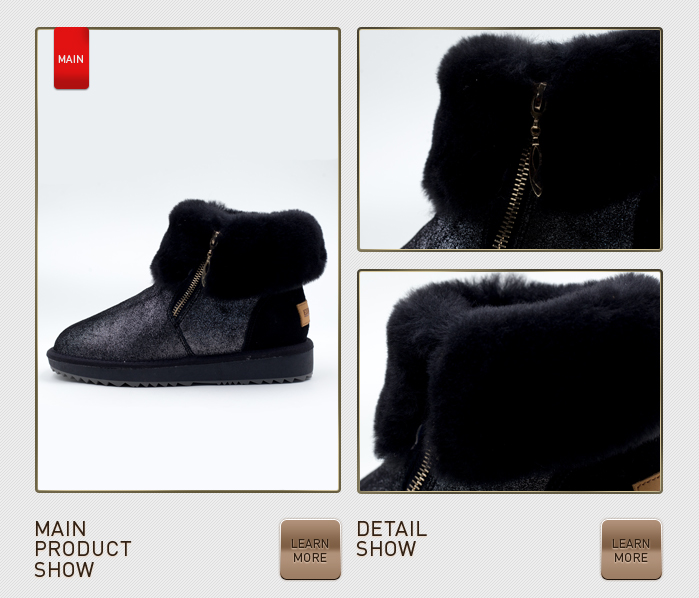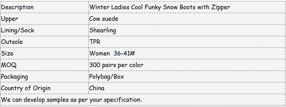 Description Winter Ladies Cool Funky Snow Boots with Zipper Upper Cow suede Lining/Sock Shearling Outsole TPR Size Women36-41# MOQ 300pairs per color Packaging Polybag/Box Country of Origin China We can develop samples as per your specifica