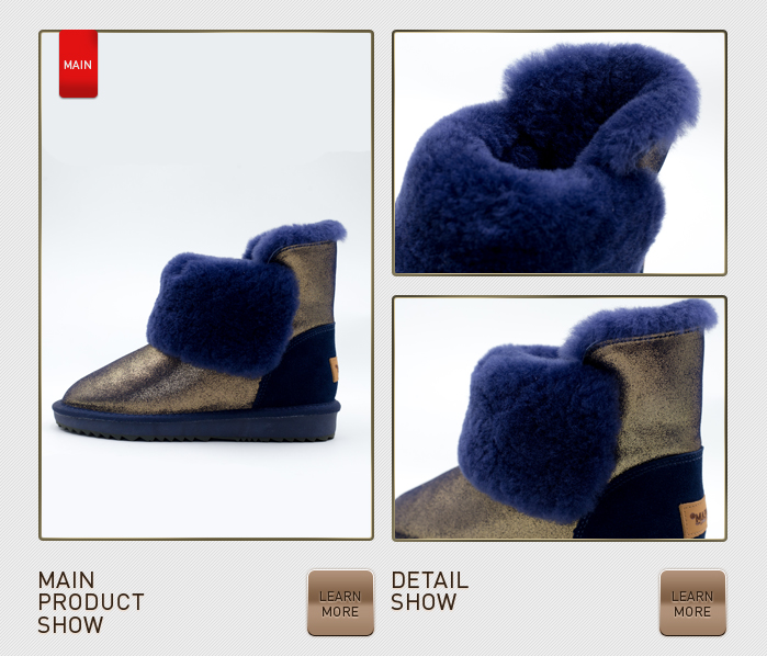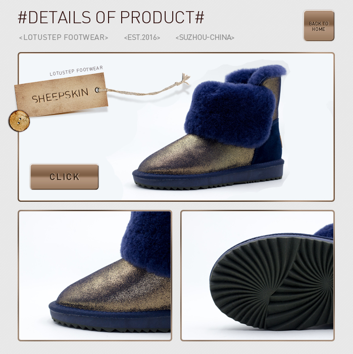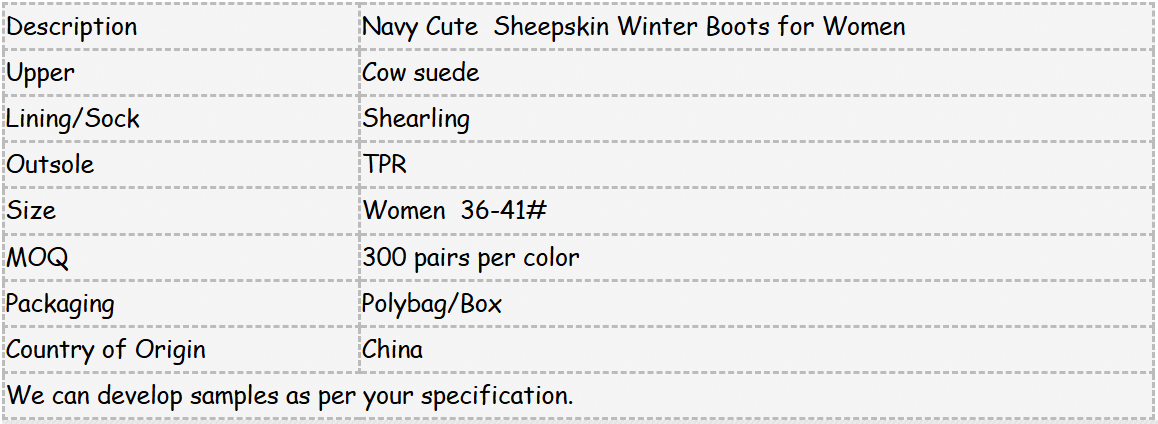Description Navy Cute Sheepskin Winter Boots for Women Upper Cow suede Lining/Sock Shearling Outsole TPR Size Women36-41# MOQ 300pairs per color Packaging Polybag/Box Country of Origin China We can develop samples as per your specification.