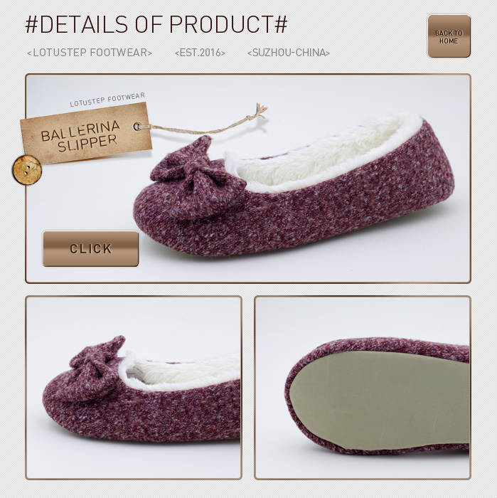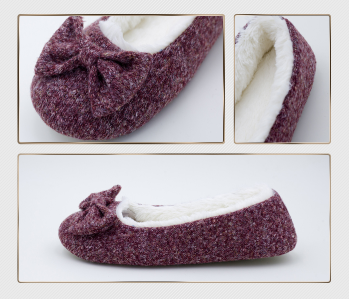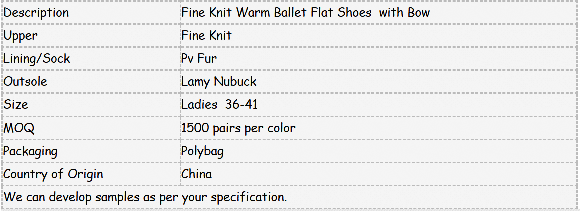 Description Fine Knit Warm Ballet Flat Shoes with Bow Upper Fine Knit Lining/Sock Pv Fur Outsole Lamy Nubuck Size Ladies 36-41 MOQ 1500 pairs per color Packaging Polybag Country of Origin China We can develop samples as per your specificati