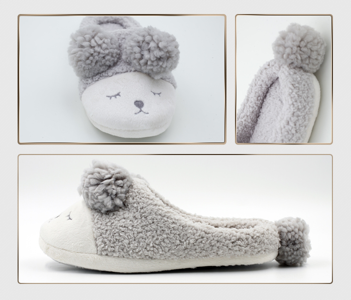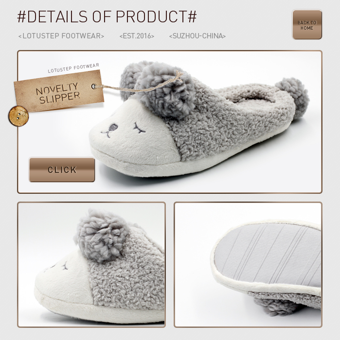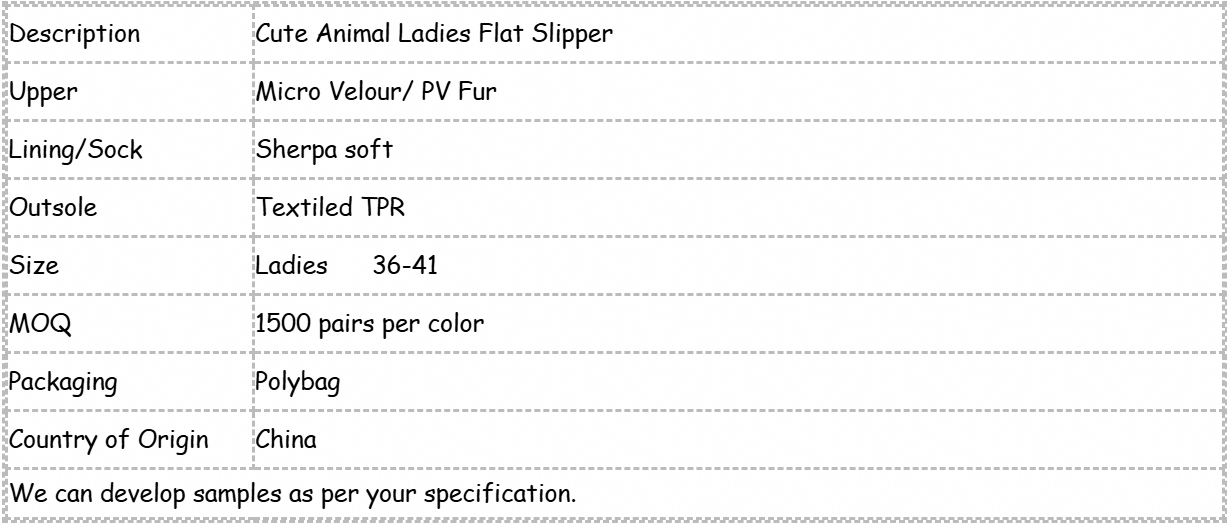 Description Cute Animal Ladies Flat Slipper Upper Micro Velour/ PV Fur Lining/Sock Sherpa soft Outsole Textiled TPR Size Ladies 36-41 MOQ 1500 pairs per color Packaging Polybag Country of Origin China We can develop samples as per your spec